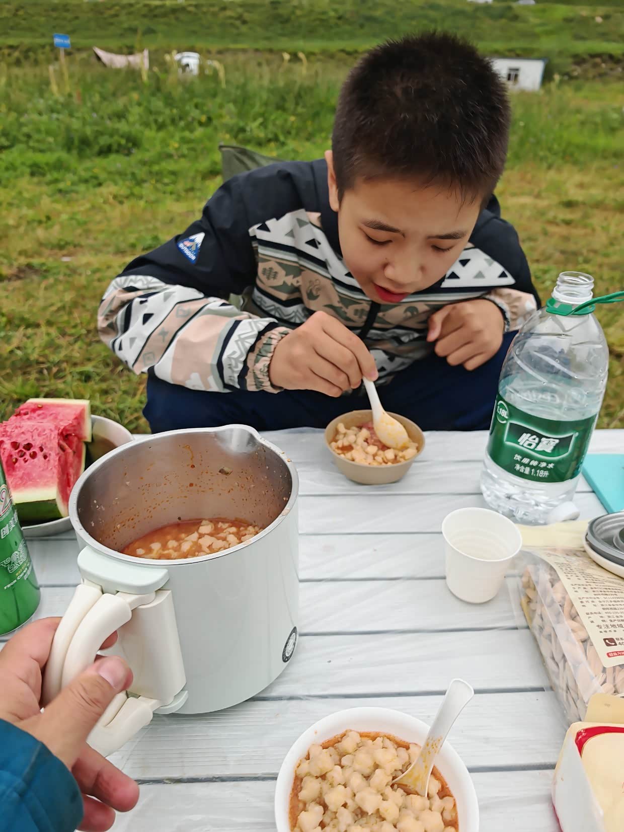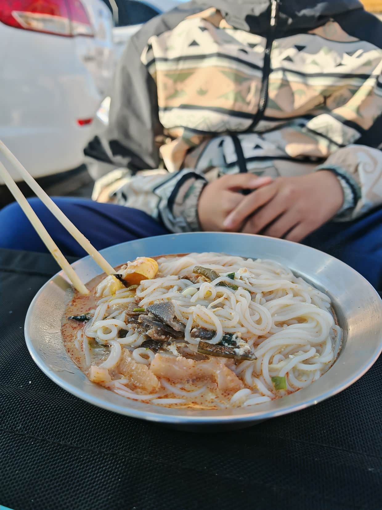 晚上给孩子煮的米线,在鹿角湾,晚上十几度还有风,不吃点热的不行。
