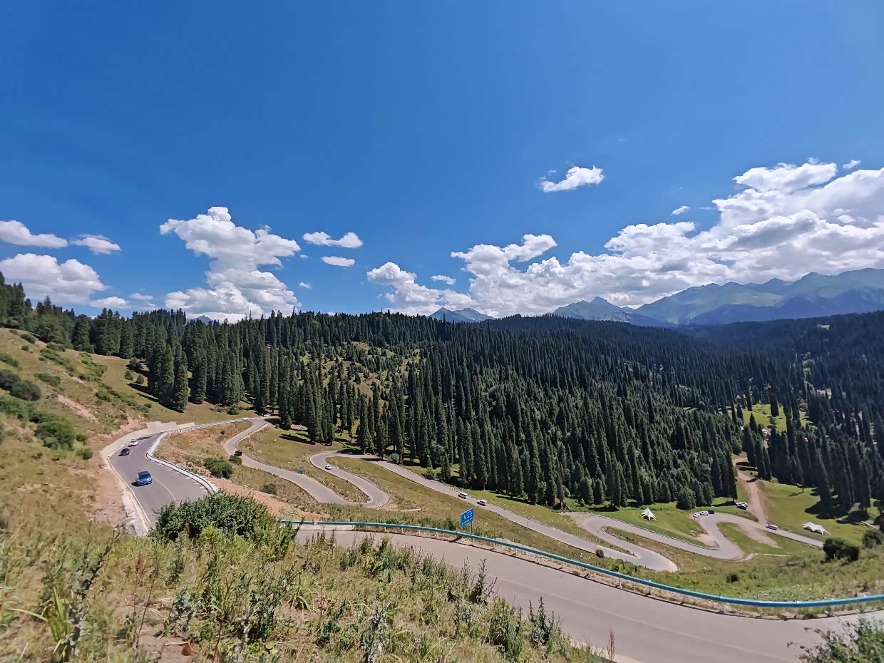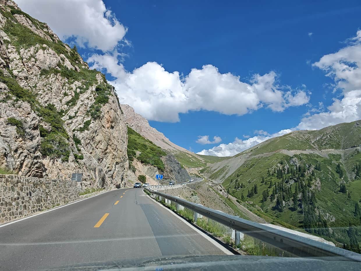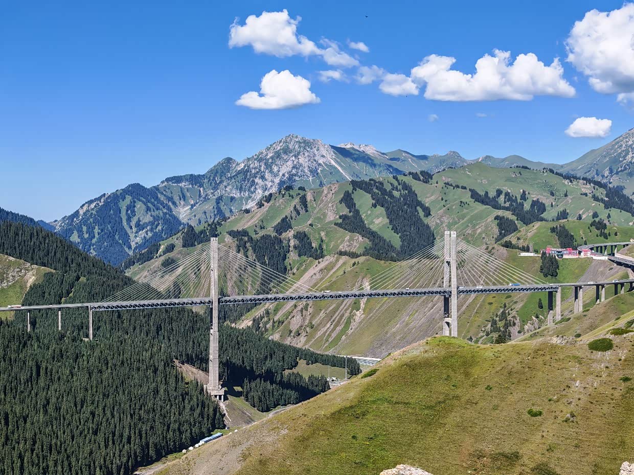 大概中午12点左右出的赛里木湖,去往伊宁的路上到了网红打卡点“果子沟大桥”,也有停车的地方,我们下去好好的看了看