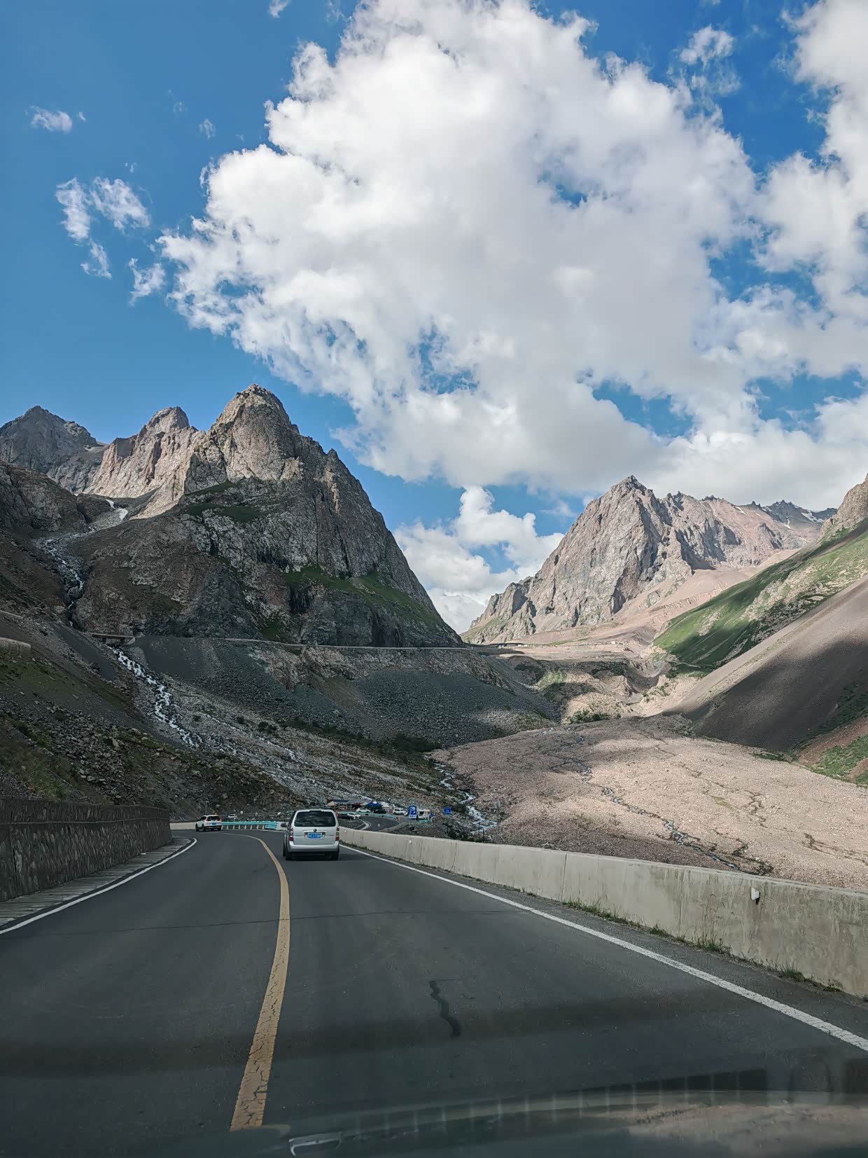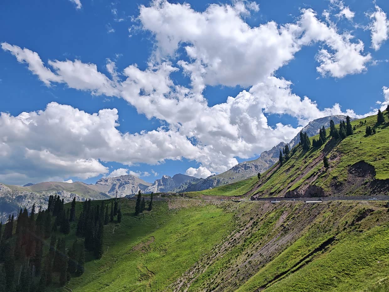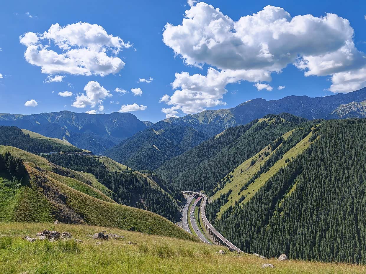 大概中午12点左右出的赛里木湖,去往伊宁的路上到了网红打卡点“果子沟大桥”,也有停车的地方,我们下去好好的看了看