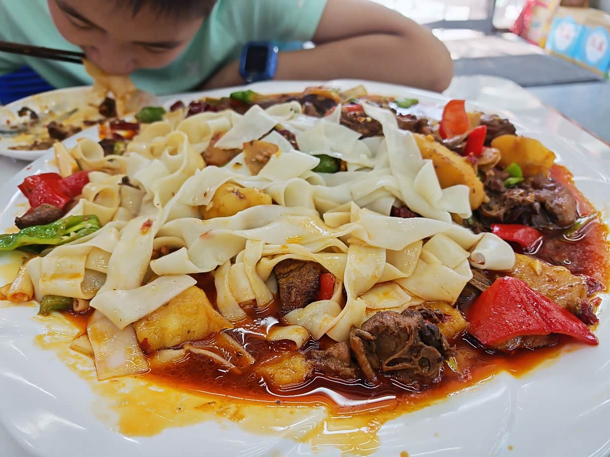 其实还有一个叫“大海子”的景区,检查站的工作人员说,路很烂很远,你的车不行,得纯越野才行,我这人听劝,老老实实就回去了,不过看了小海子,很有惊喜,确实很美很美。中午回精河县吃的正宗新疆大盘鸡,确实和我们洛阳这边的味道不一样,非常好吃,你看这分量,我觉着三四个人吃都够了,99双人餐,还有一份面,还有免费的小菜和骨头汤,最后实在吃不动了,打包带走,连打包盒都是免费的,精河县人民够大气,好评,点赞