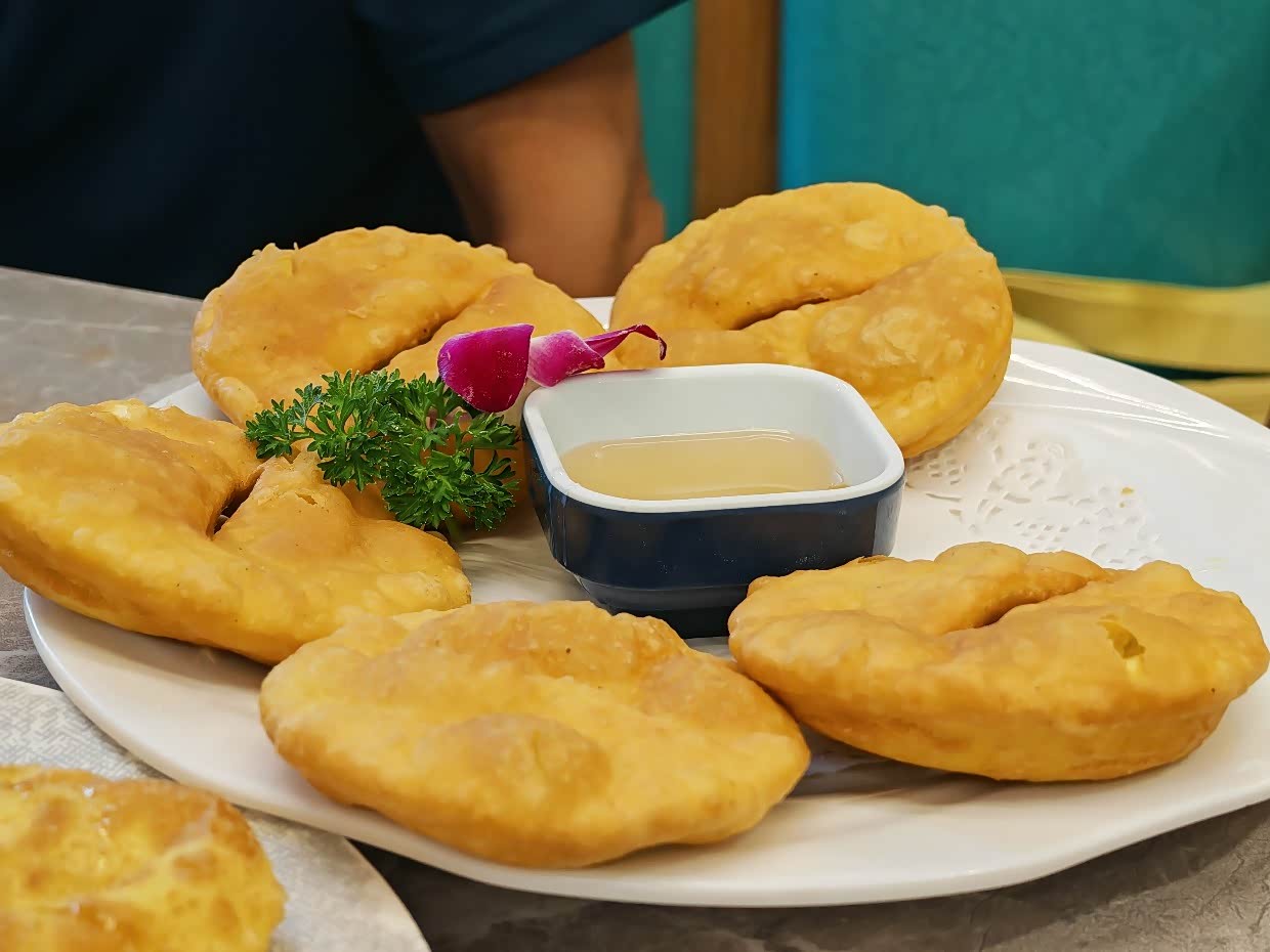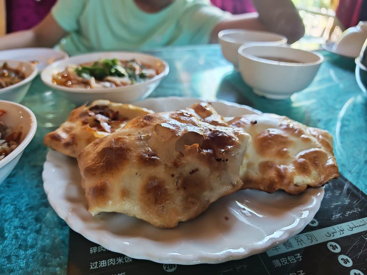 离开赛里木湖,去往伊宁,在艾勒喀斯尔餐厅吃的饭,吃了传统维吾尔族美食,烤包子、手抓饭、碎肉拌面、凉粉等,孩子开心极了,吃个饭充电的地方距离这里只有几百米,吃完刚好充满,简直不要好太好,出发,伊昭公路!!