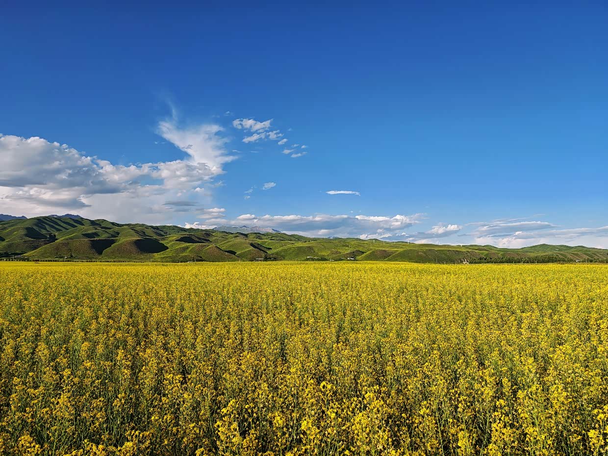 大片的油菜花,映着蓝天白云和山峦,一幅美丽的油画