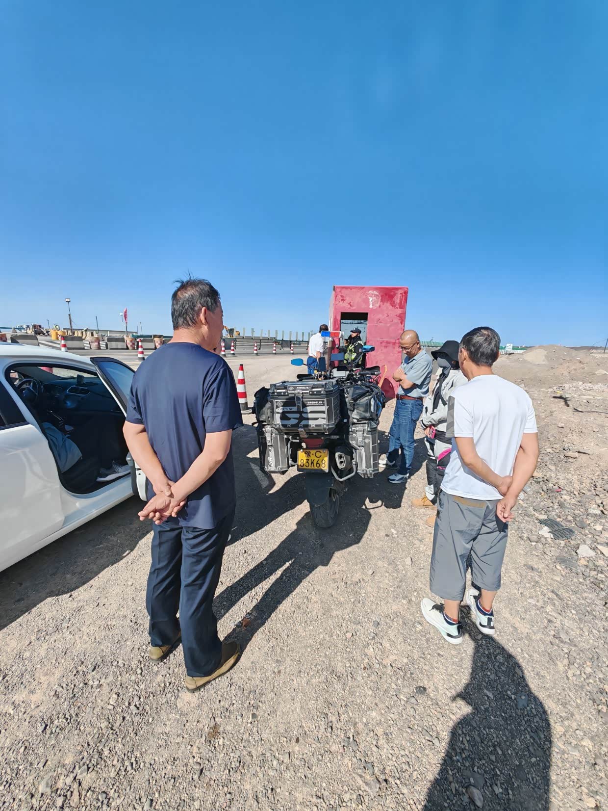 在这里遇到一个有意思的事,从哈密到吐鲁番到公安检查站,等待放行的时候看一辆洛阳牌照的摩托车,很多人都围上去问这问那,后来才知高速摩托车可以上,但是不能带人,这对夫妻一辆一辆的问看谁能帮着捎一段去吐鲁番,我正好顺路,车上就我和孩子,后排正好有位置,就理所当然的捎上了
