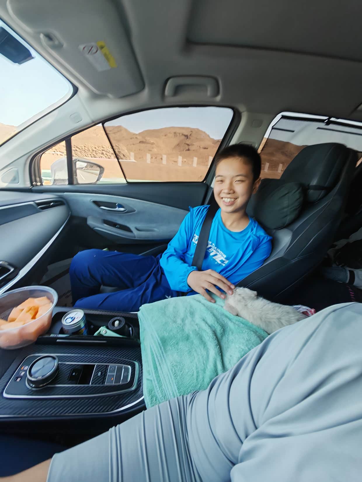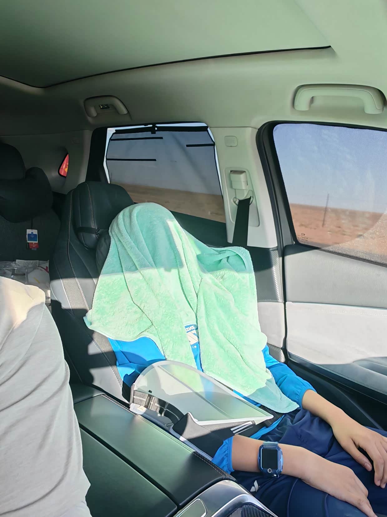 话说吐鲁番的晒那是真的晒,孩子被晒的头上盖毛巾,到后来直接躲后排去了