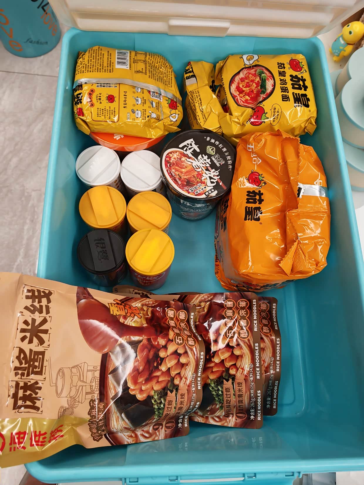 这是部分速食,孩子爱吃的螺蛳粉、牛羊肉泡、自热饭那时候还在路上,一路应急凑合,吃饭很少重样