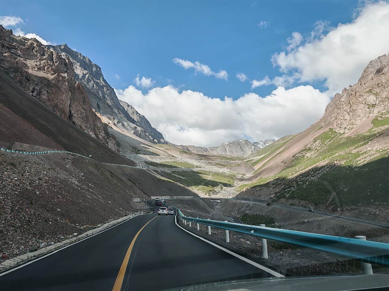 独库公路北起新疆克拉玛依市独山子区,南至阿克苏地区库车市,全长561公里,纵贯天山南北,是G217国道的核心路段。最高点铁力买提达坂海拔超3400米,一半路段海拔在2000米以上。每年6月至10月(2025年于5月31日提前通车),冬季因积雪封闭,我们走的是乔尔玛到独山子这段,一百多公里,是最险峻最壮观的一段,路上最低温度7°,到独子山气温36°,相差快30°