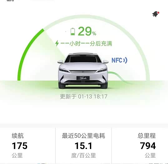 大白第4次充电,2020年12月29日提车半个多月了,行驶总里程794公里,本次剩余电量29%(76.9*0.29=22.3kwh),剩余续航175公里,,本次区间内行驶794-520=274公里,计算续航274/0.71=385.92公里。能耗54.6/274=0.199Kwh/Km 。