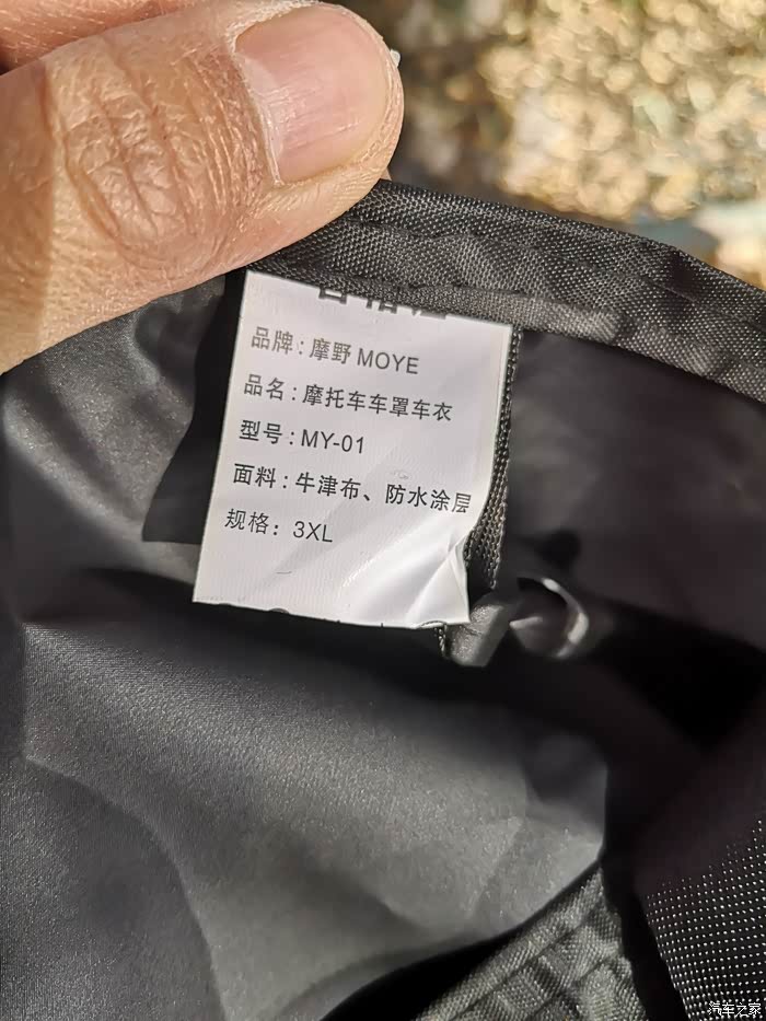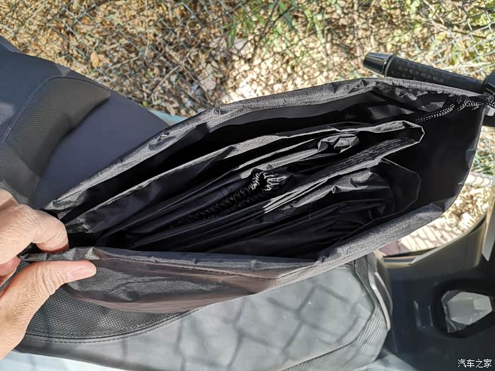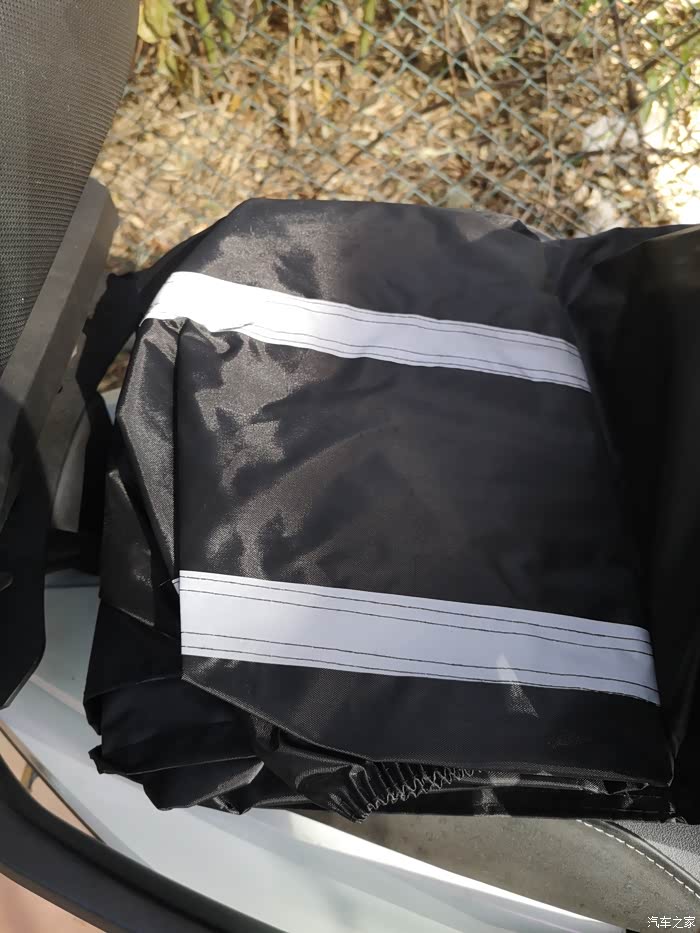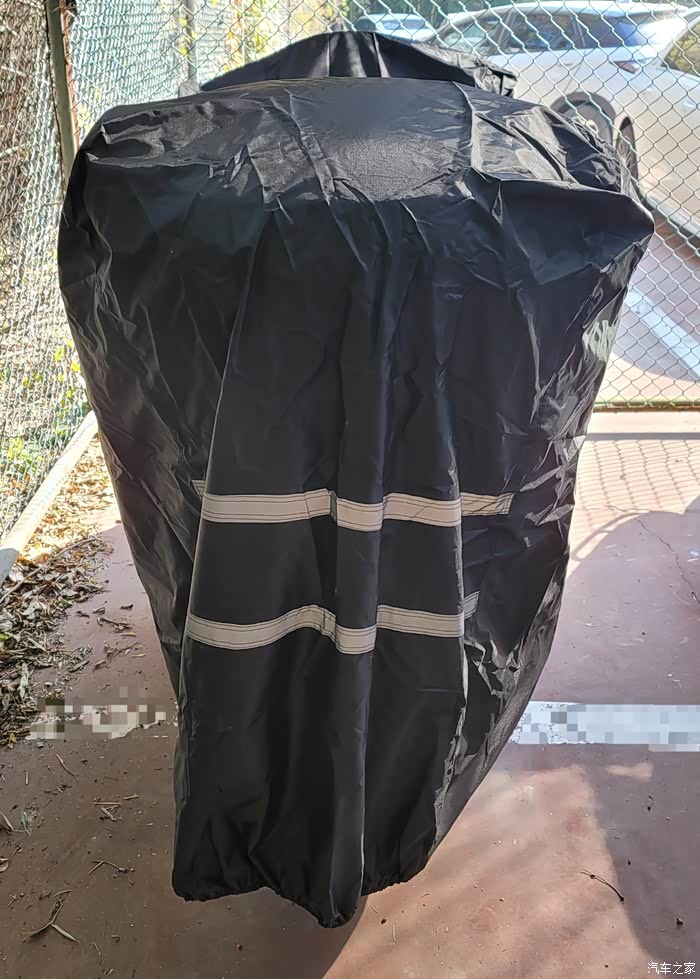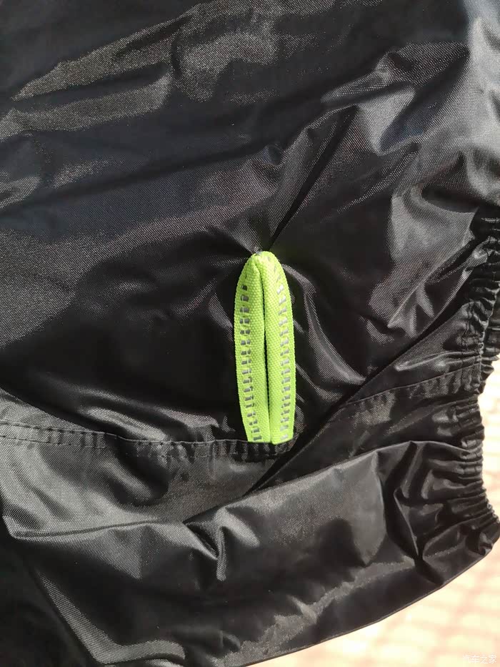 车衣取出时,感觉就像取出了一个装有重要文件的档案盒,四四方方,折叠整齐。顺势摊开以后,车衣的logo以及前脸锁眼孔、后脸的反射光条都很让人耳目一新,尤其是底部防风带设计,值得点赞,塑料卡扣锁住非常便捷,有效防止大风吹走车衣。
