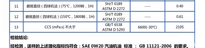 10.抗磨性能,四球机法,低温75度,低负荷磨斑直径,美孚EP020以及其他多数020机油的磨斑一般在0.42-0.46mm之间,添加后磨斑直径0.39mm,低温抗磨性能有所提高。