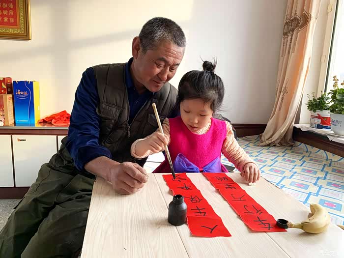 回到家我就比昨天轻松多了,写好了对联,女儿就黏着爷爷陪着她赶紧给车贴上。