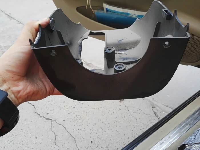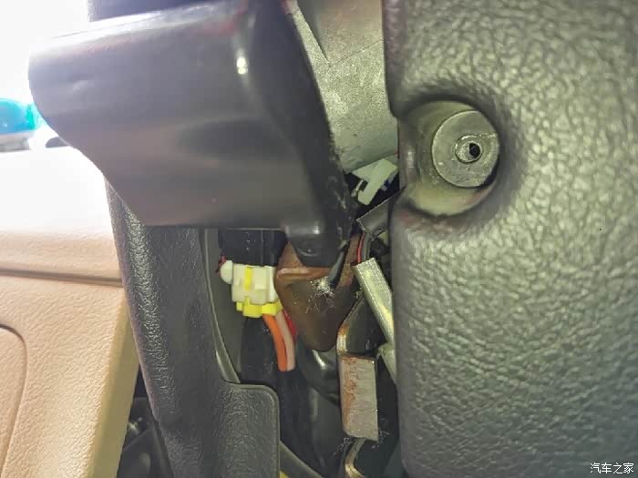 上侧和下侧各有一个固定螺丝,也要把车打着打动方向盘到便于操作位置。