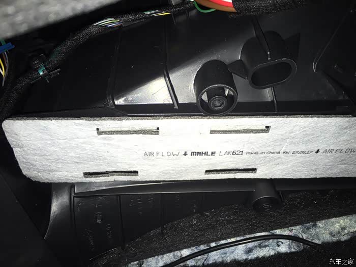 第三步:拆下空调过滤网的盖子,如下图,往左(驾驶座方向)滑动即可打开,打开后就可以看到过滤网了。垂直往下拉即可取出过滤网。把新的过滤网装上,注意过滤网的安装方向。