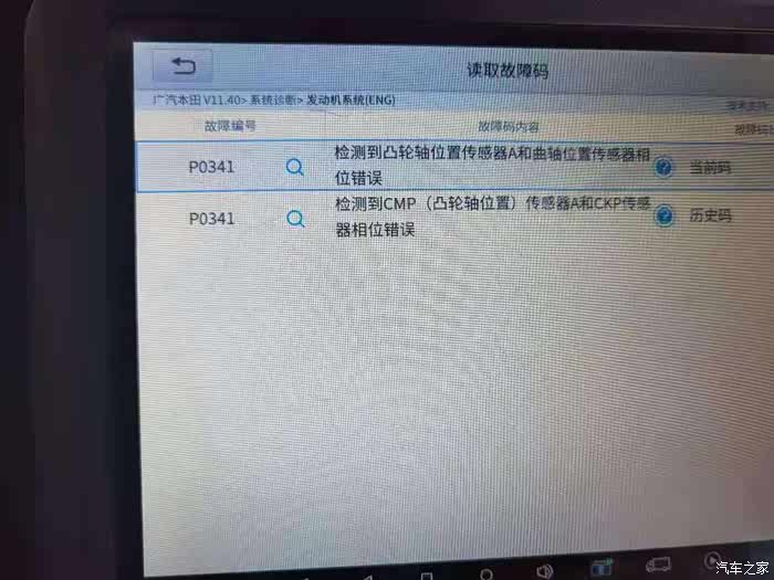 故障出现,故障如图,P0341,检测到凸轮轴位置传感器A和曲轴位置传感器相位错误。出现时间2021年5月10号-11号期间。刚出现的时候,我以为是燃油过稀引起的故障灯亮,准备去消除一下故障码,结果检测出来,并不是。这个时候我有点小慌。老板的意见,先检查看看,不一定是大问题。