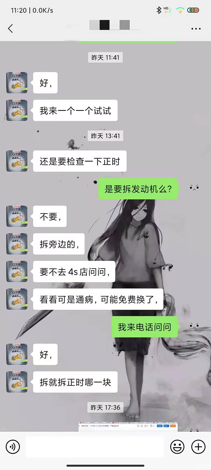 5月12号,因为工作原因,我把车子送到公司附近的修理店做检查,老板折腾了一上午,对线路、传感器、机油各个可能引发的问题进行了排查,下午告诉我,可能需要拆正时。并建议我到4S店问问,看看是不是通病,是否能免费更换,在此前提下,我分别致电了新站区4S店和厂家800;4S店答复同上,过保,没有接到通知免费维修,如果开到店里检查,可能有2,一是机油脏引起的故障,网上说的正时链条拉长或VTC执行器裂开。如果是后者,4S店没权免费维修,需要报厂家,依据厂家判定确定是否为免费。暂时未遇到过裂开的情形。如果拆开后,不是,所有的检查维修费用自理。厂家这边回答就开始打太极,什么没确定下来是什么故障,过保。如果是VTC问题,也要具体问题具体处理,免费维修可能性不大,已经过保了,不可能保终身之类。巴拉巴拉,大致意思,你先确定是什么故障。然后再讲。