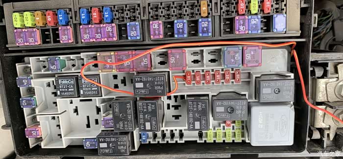 左边红色的就是福特专用的小保险片,体积 非常小,这也是源自我上一辆进口锐界的时候因为找不到这种保险片,害得我有一次跑高速的时候玻璃升降机保险烧坏之后开着车窗大冬天跑高速,后来从4S预定了5个原厂保险片,5元一个。