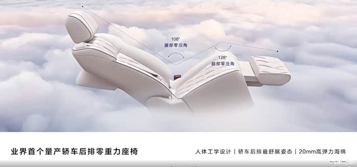 业内首发轿车后排零重力座椅,坐垫厚度高达90mm,搭配12向电动调节,包括2向电动头枕调节、以及4向电动腿托腿托调节。