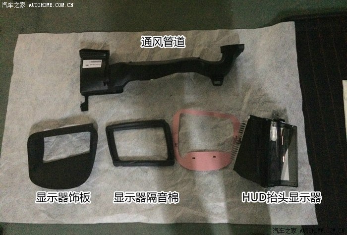 HUD显示器、通风管道、显示器饰板、显示器隔音棉、显示器视频线束(图略)、HUD专用雨量光线传感器