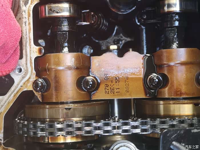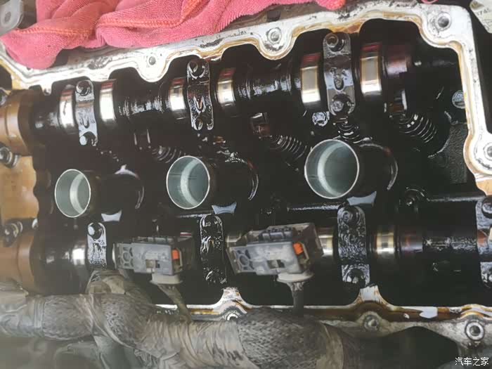 这是拆掉气门室盖后凸轮轴的情况,全是油泥,得好好清洁一下。