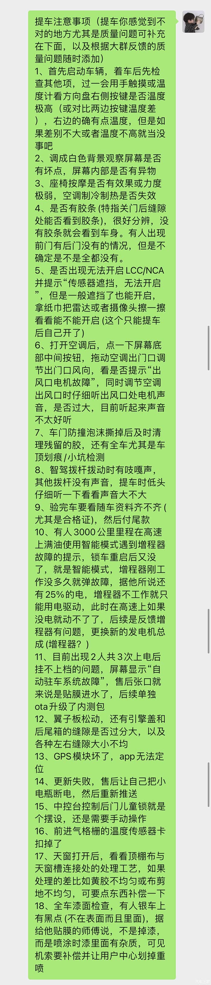 检查车辆:这一步非常关键,很多车友群都有总结,大家可以参照,我也给大家贴图。检查的过程中,有任何问题直接问交付专员,这个流程交付会耐心的等你检查完所以事项,很有耐心,我很欣赏!