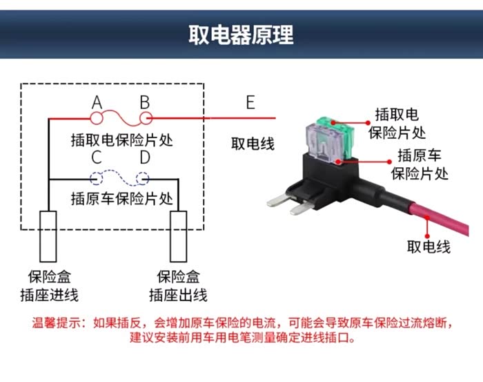 然后把取电器插到,刚才从车上保险盒取下保险丝的位置,如图位置