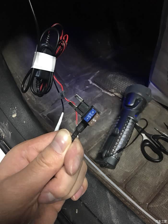 下面把原车的保险丝15#,和提前准备好的5#保险丝分别插到取电线对应的位置