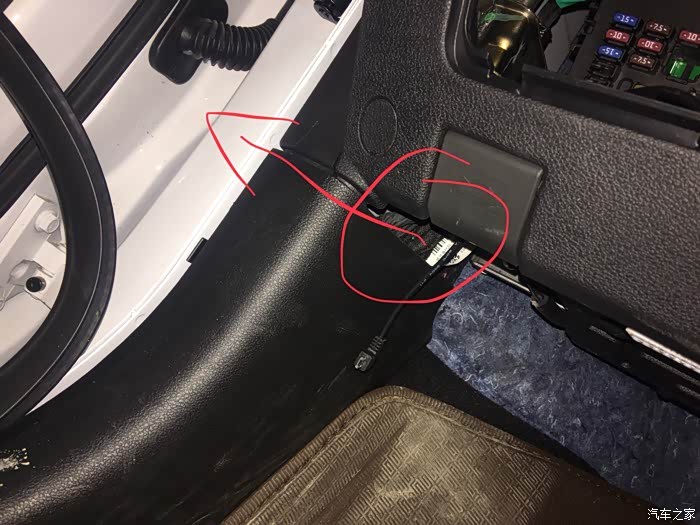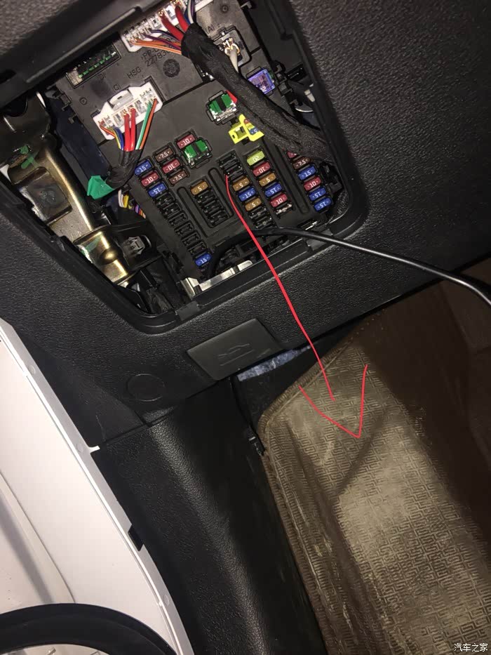 把降压线插记录仪的一端从保险盒的里面穿到下面,如下图