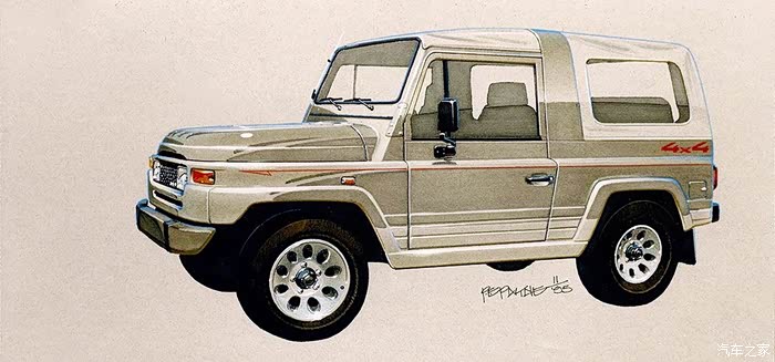 另一个方案。这也许就是后来我们见到的方案,不对钣金进行大面积的改动,而是使用附加的塑料覆盖件进行外观改变,前后翼子板,保险杠,前格栅和大灯等全部具有了BJ2020TY陆迪的基本面貌。