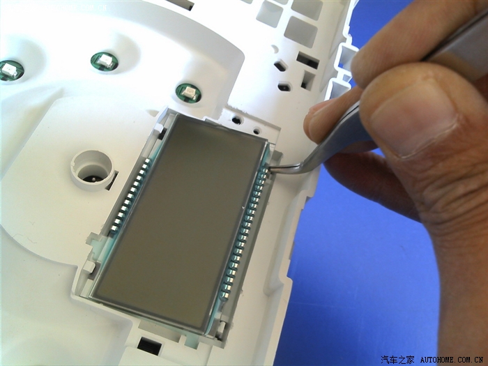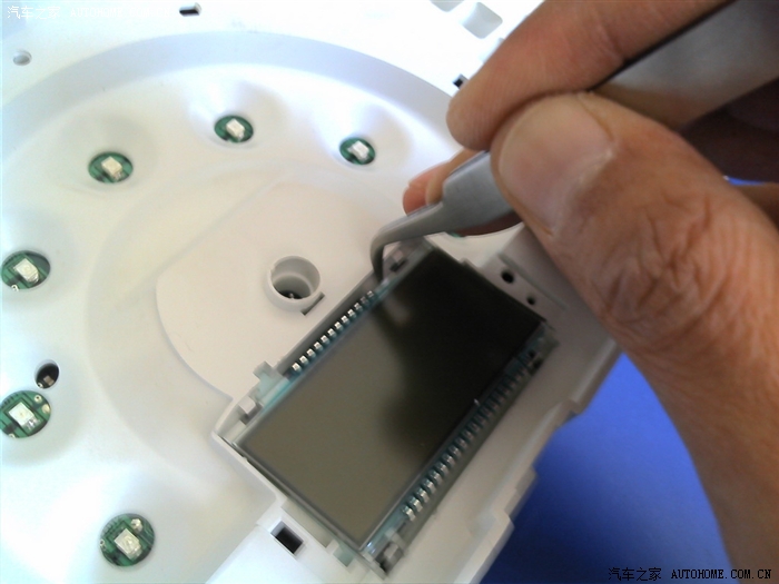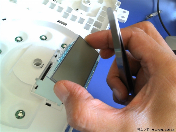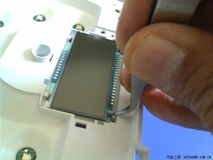 现在开始卸行车电脑显示屏了。显示屏上有个小罩,图片上用镊子挑开的部分是卡扣,用力拔就可以卸掉小罩子的。