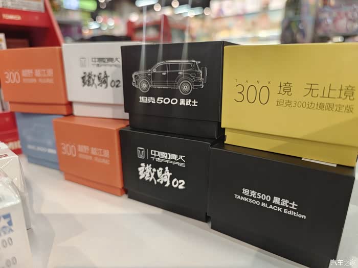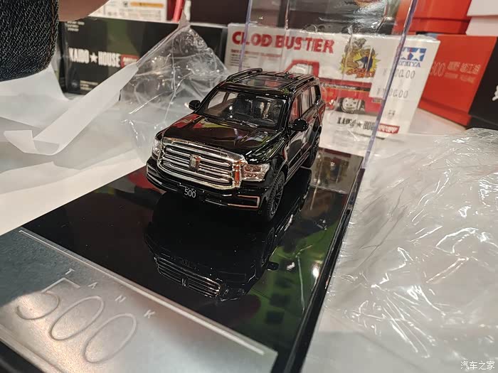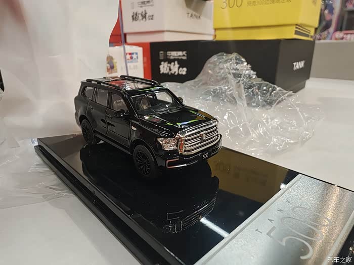 吃完饭后我们又在商场里溜达一圈,在一个卖玩具的摊位我瞅见旁边展柜里摆着个小玩意儿——1:64的坦克500车模,跟咱停地下车库的那辆一模一样,金属漆的黑色车身,轮毂上的纹路都跟真车似的,连后备胎罩上的小logo都做得贼精致。闺女踮着脚扒拉展柜玻璃喊:“爸爸的坦克500!迷你版的!你看那前脸的进气格栅,跟真车一样有棱有角,还有侧面的腰线,连踏板上的防滑纹都做出来了。”看见这模型我们都觉得亲切