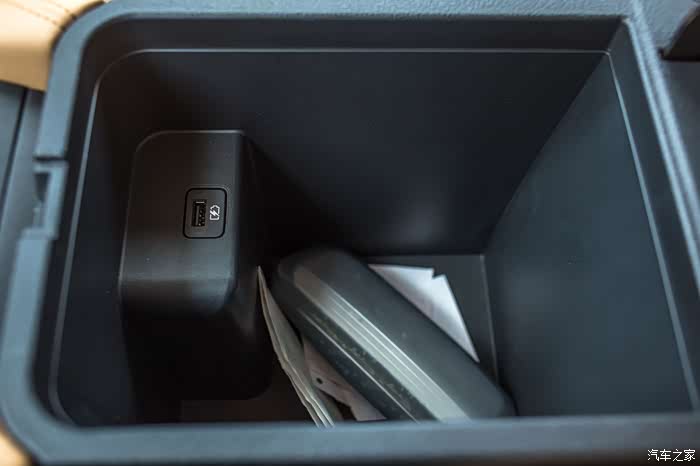扶手箱的储物空间可谓是宽大而深,配有一个USB口。