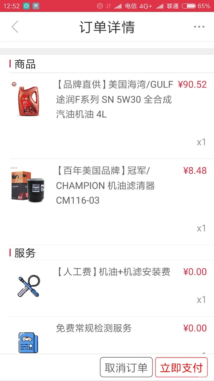昨晚抢到的99小保养套餐,海湾全合成机油,最多就是三类基础油,冠军机滤。合算吗?