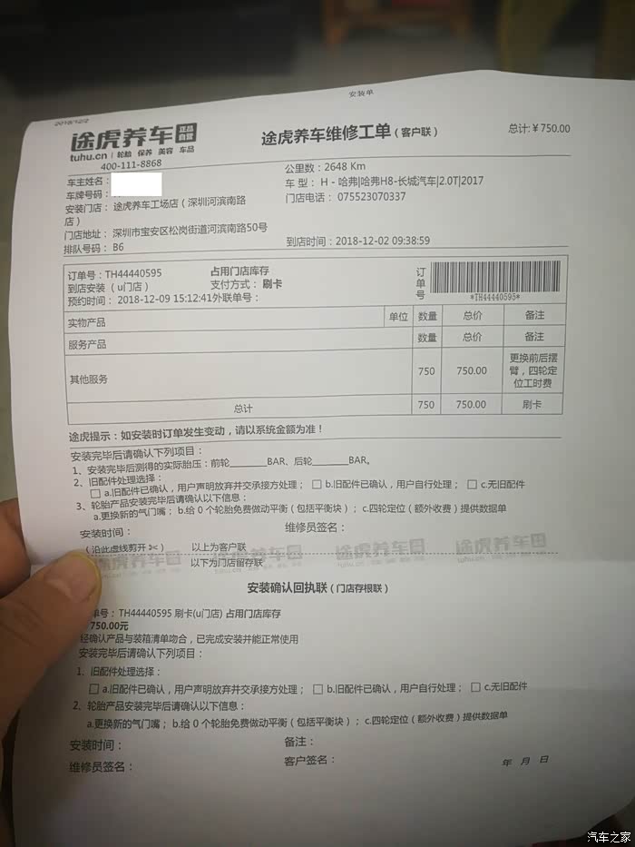我们回店固定螺丝,然后告别了夜神。这个是途虎店给我开的费用清单,因为途虎店提供了设备和场地,而且还提供了人工。另外,途虎店在一个月之内还提供一次场地设备,供复位检测之用,这样下次我来复位时就不用花钱了,前提是我要在一个月之内跑完2000公里。