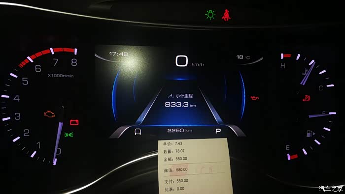 加完了油,电脑显示可以巡航710公里,这简直就是惊喜,我家的H9每次加完了油,一般都显示续航里程400多公里,只有自驾游时,才有可能显示超过500公里的续航里程。同样的发动机,同样大小的油箱,车重只差了一百多公斤,真是不错的表现,非常令我满意!