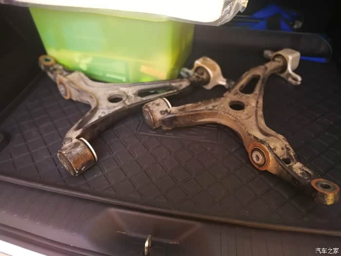 夜神让途虎店的师傅把上次拆下来的铸铁悬挂给我装车上带回去,我说我不要了,已经换了新的铝合金件,还留着这个铸铁件干什么?夜神说这个铸铁件没什么用,但是这上面的6个胶套有用,将来铝合金悬挂的胶套老化了,就可以把这个胶套拆下来用了。我想看看能不能把胶套拆下来,只看了一眼,我就放弃了这种幼稚的想法