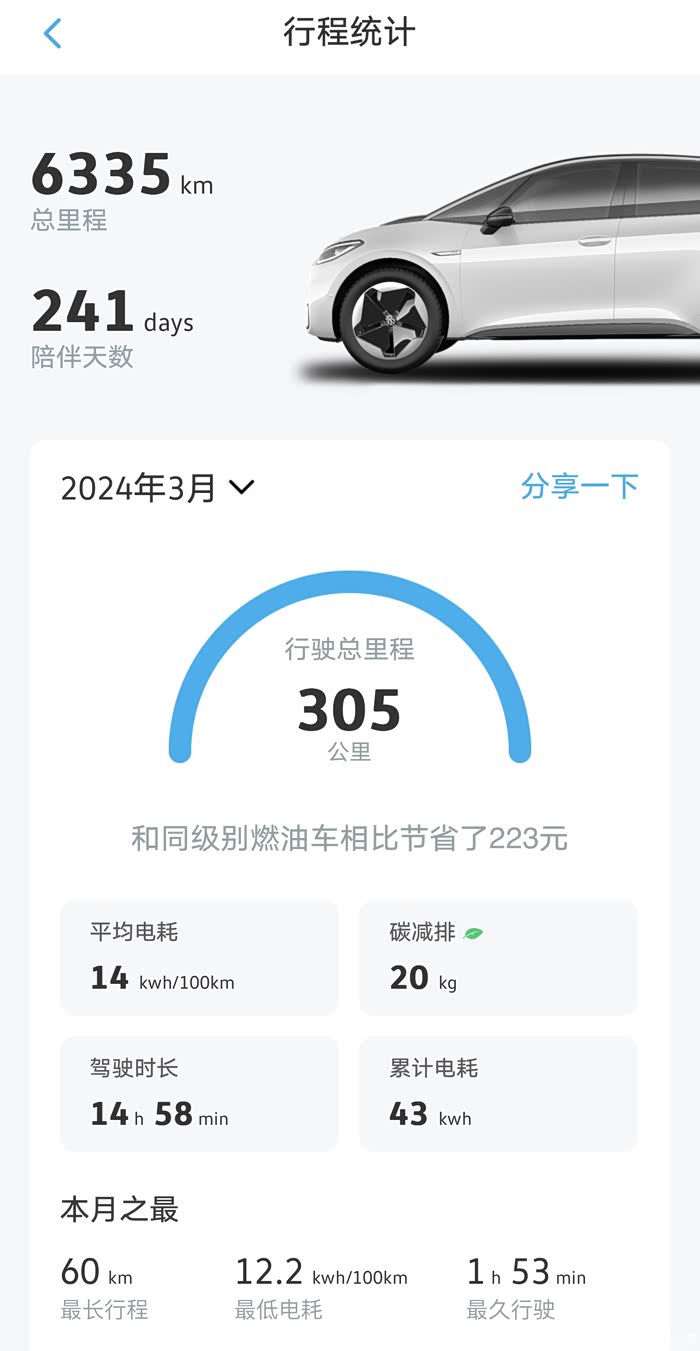 我是大众23款ID3车主,我是去年7月份ID3首次降价后,享受到福利的车主。目前开了6329公里,这200多天使用下来ID3续航还是比较实的,续航里程也是满足我个人用车需求。