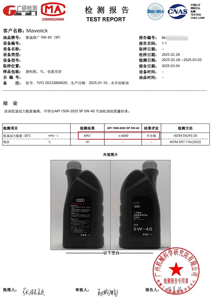 ,这是一瓶精仿一汽奥迪原厂5W-40黑桶机油,实测7项指标中虽然只有CCS不合格,但其他指标跟正品不符,后送到广研实测CCS同样不合格,一起看一下数据吧!