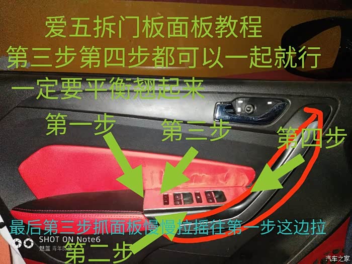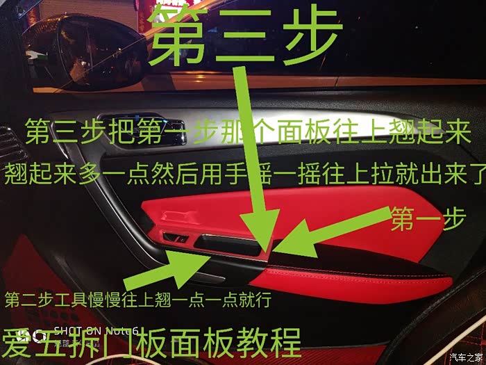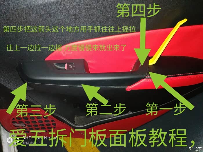 工具大家自己看吧!图片那种工具很好用 记住慢慢翘起来 除了主驾驶其他三个都容易拆 主驾驶最后要慢慢往第一步这边往上拉起来 斜着往上提 就会出来了