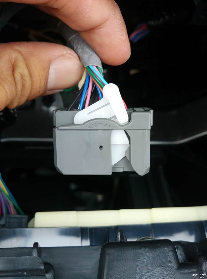 拽开之后不要用力拉出来,因为双闪灯的插头线很短。从这个图可以看出,拉出10厘米基本已经到线的长度极限了。把这个插头拆下。看到插头上中间一个小舌头,捏住,往外拔,就ok了。