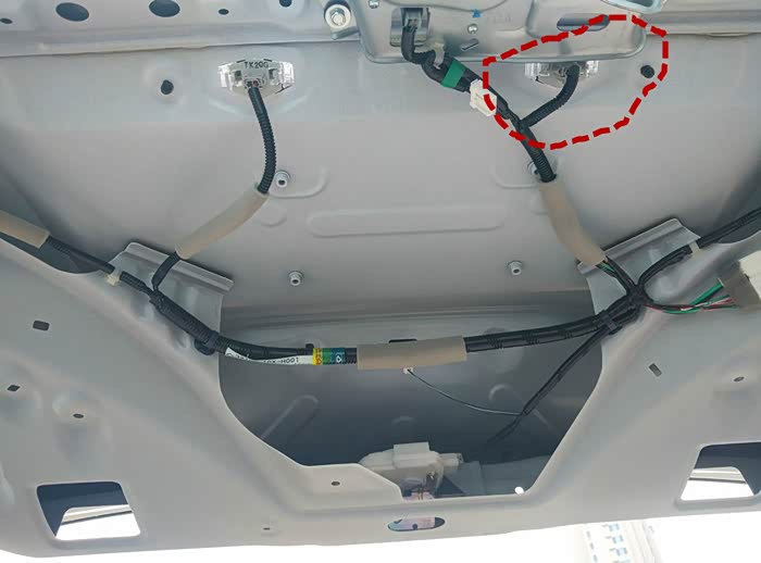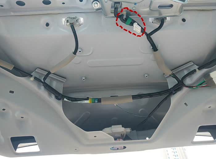 这是打开之后的后尾门内侧,可以看到,用绿色胶带绑起来的插头就是倒车摄像头的对接插头。买了原厂的倒车摄像头,就可以跟它对插就ok了。