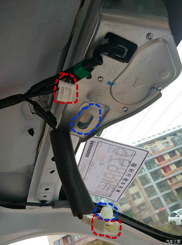 把购买的原厂摄像头从门外面穿进来,把摄像头上塑料灯碗与车上的孔对起来,安装方法与刚才拆灯碗的方法类似,然后将左侧的牌照灯插到这个新的灯碗中。将摄像头的插头与车上的插头对插(图上红色标注),将摄像头上白色的卡子卡进车上蓝色标注的位置,就固定好了。然后接上电瓶负极,启动车辆,进入到重要一步!