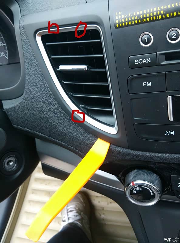按照其他人的做法,一开始现将原车两侧的空调出风口拆下来。这两个出风口是通过三个卡子(在图中标注位置)固定的,撬的时候先撬下边,要撬卡子附近的位置,方便把卡子撬开。同理,撬完前面再撬上面的两个。两面都撬下来,放在中控台前面。