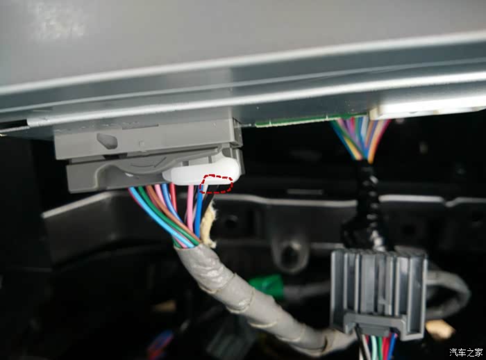 把双闪灯的插头拔掉后,继续往外拉,把后面的插头一一拔掉。其中,最大的那个插头比较难拔。大家看图中用红色虚线标注的位置,这个地方也有一个小舌头,是在这个白色的部件中间,把这个小舌头压下来,然后把整个白色部件沿着旁边箭头的反方向掰开,然后再将插头整体往外拽就可以了。