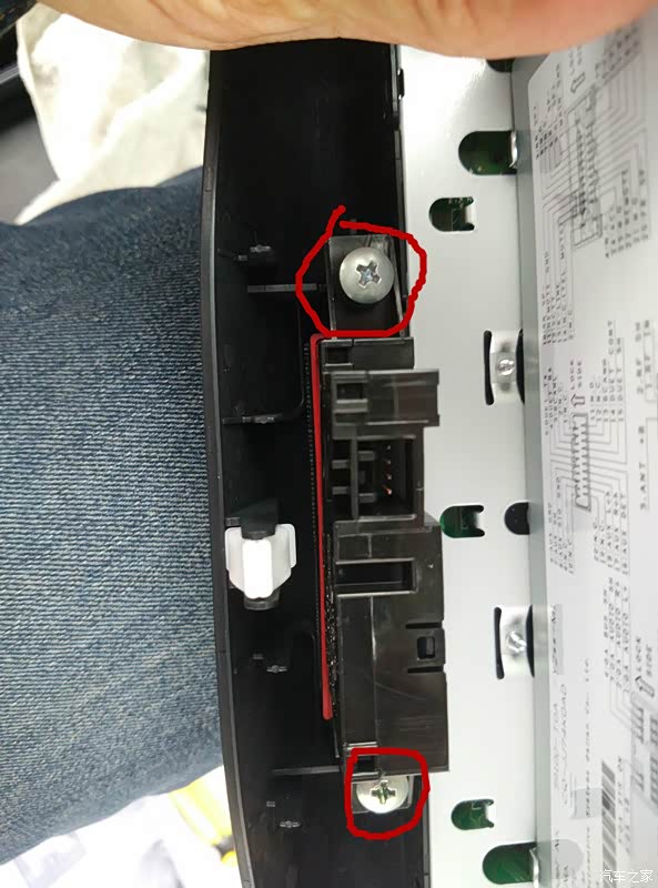 撬完之后,中间的原厂CD机就暴露出来,在图中标注处有两个固定用的螺丝,左右各一个,螺丝下面黑色的点是一个定位点,一会我们的新的大屏安装的时候也要对准这两个定位点。 将这两个定位螺丝用十字螺丝刀卸下来。这两个螺丝原厂估计是用机器装上的,很紧,最好用螺丝刀一股劲给拧松。卸完之后统一放在中控上的小屏幕那里。然后两手抓着CD机两侧,缓慢用力向外拽。
