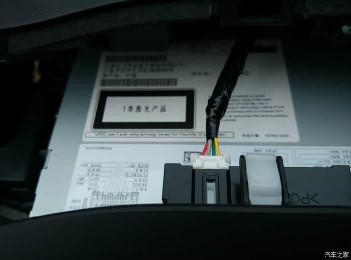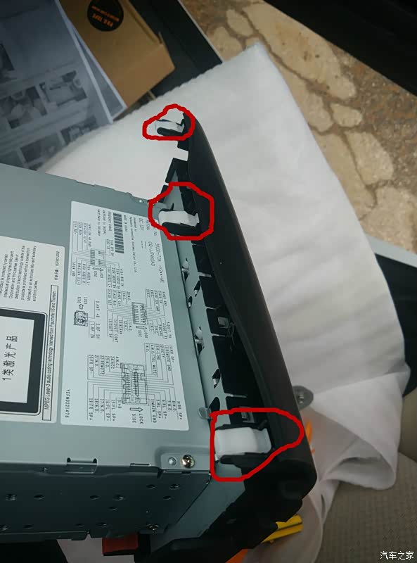 将原厂机器上的双闪灯安装到新的大屏上,将原厂机器上两侧的支架卸下(每侧的支架有三颗螺丝),安装到新的大屏上(新的大屏两侧有对应的螺丝孔)。看一下现在放CD机的位置里面,有一束用绿色胶带绑起来的接头,找到一个7针的接头,从绿色胶带处拆开,另一个接头继续绑好。