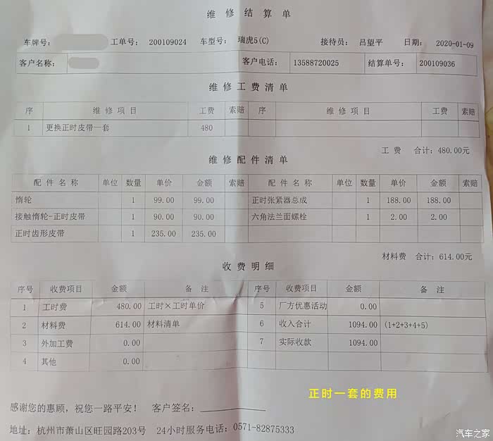 听师傅见意,本想一起把水泵一套也换掉,但少一个垫片没货,家厂订货要3天左右,有些等不急,因为一起换掉的话是不用工时的。下次单独换需要300的工时。因为年底工作上每天要用车也等不急,只能下次付工时了。师傅说我这么长时间没换正时胆大,大都在四五公里换了(估计是4S店推荐换的!)。惰轮和水泵的轮不好了都会影响正时皮带。出问题我觉得不是按公里数来确定的。可能5万公里内坏了,也可能像我这再开个5万不坏也难说。所以大家关键开车多感觉下车况、异响等。申明大家不要以我这个公里数参考来换正时哦!