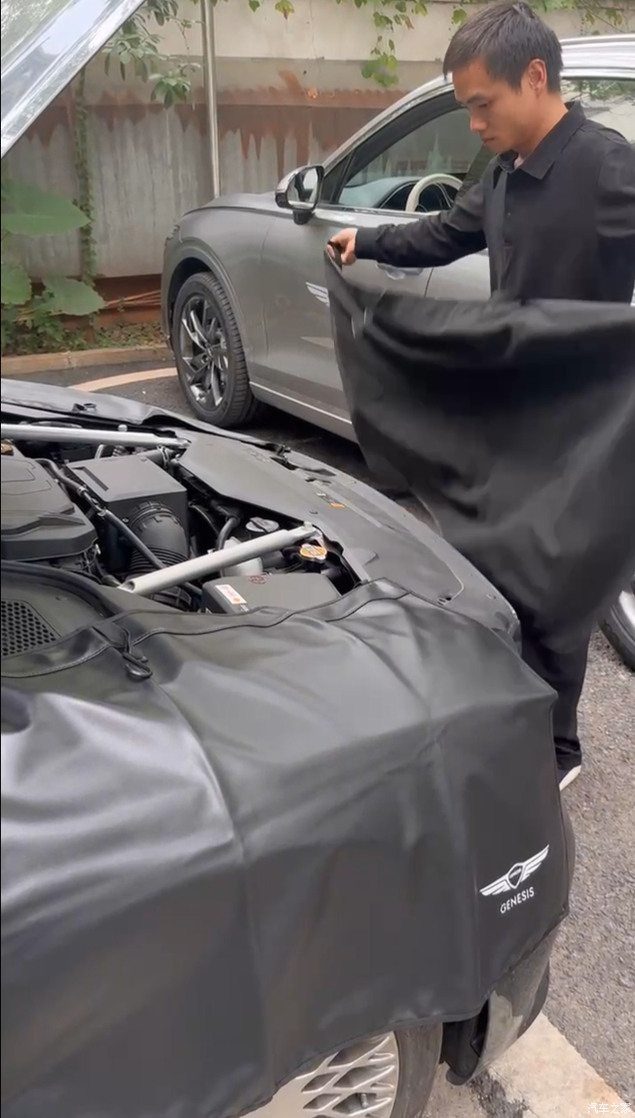 师傅开始干起来了,很专业的铺上车内车外的保护套!