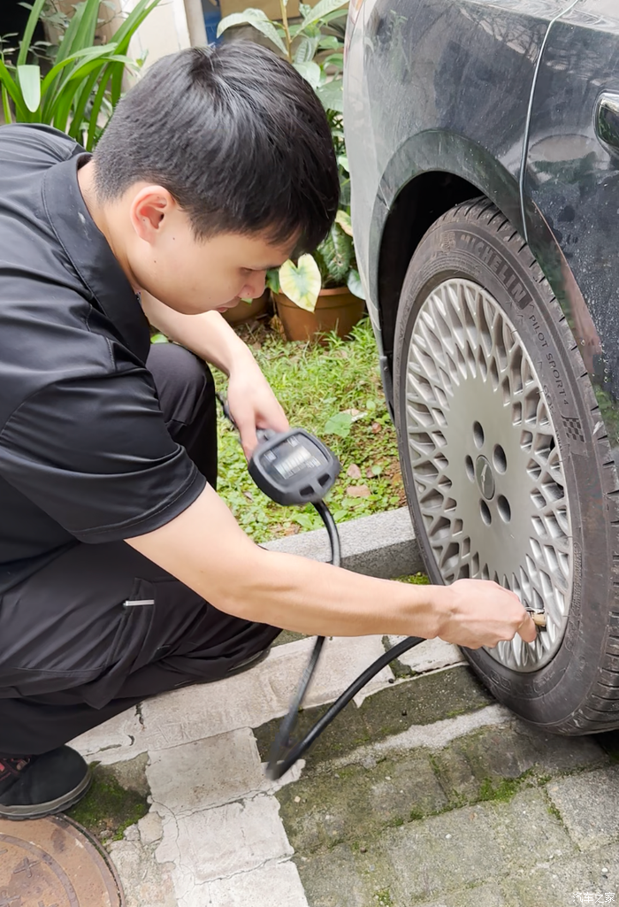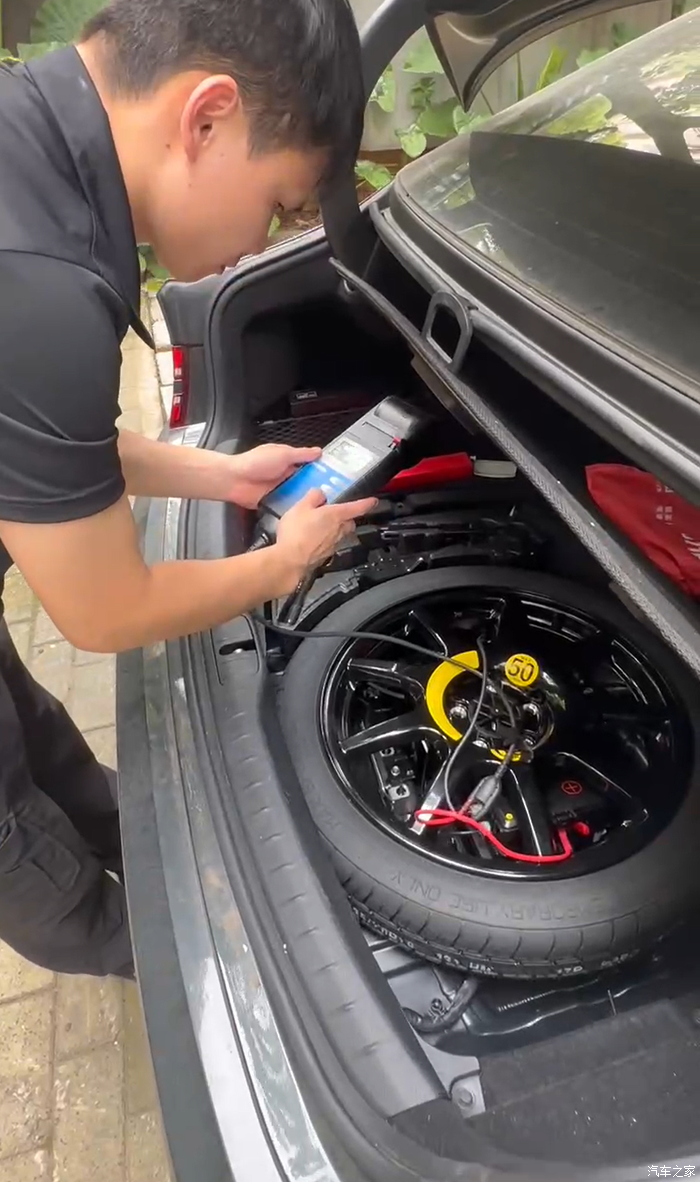 师傅在检查轮胎胎压,连备胎都没有放过,哈哈