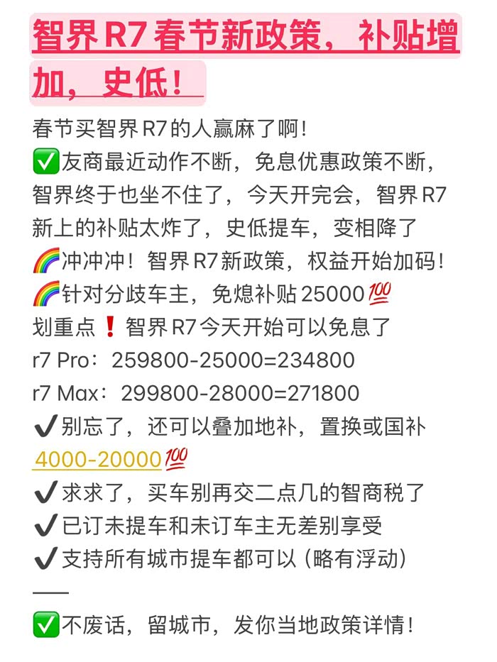 又降了!智界R7春节新政策,补贴增加!