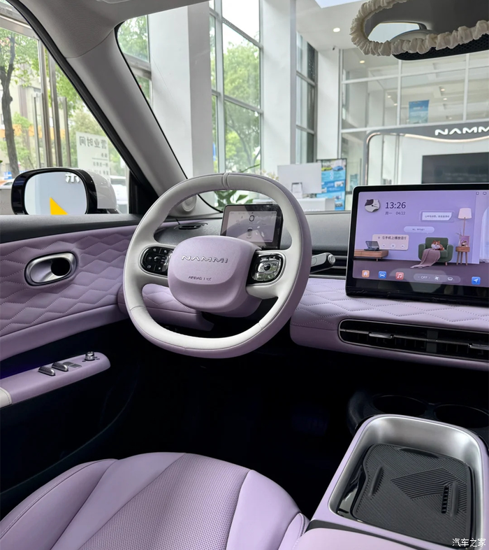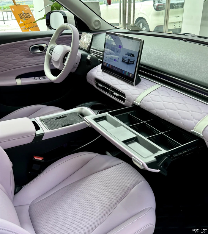 打开车门连内饰都是紫色双拼的搭配,座舱内大量采用了菱格纹和软包的材料,还配备了全液晶仪表盘和12.8英寸中控大屏,界面清晰,功能丰富,看着非常舒服,这不是妥妥的在逃公主专用车嘛!