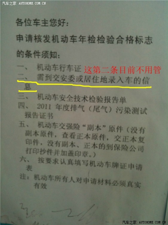 最需要注意的是:新车将满两年来审车的童鞋们,交强险一定要带上2010年的和2011年的这两年的副本,人家都要收的,我就是脑子犯傻(天儿给热的),居然只带了11年的,结果又多跑了一趟。